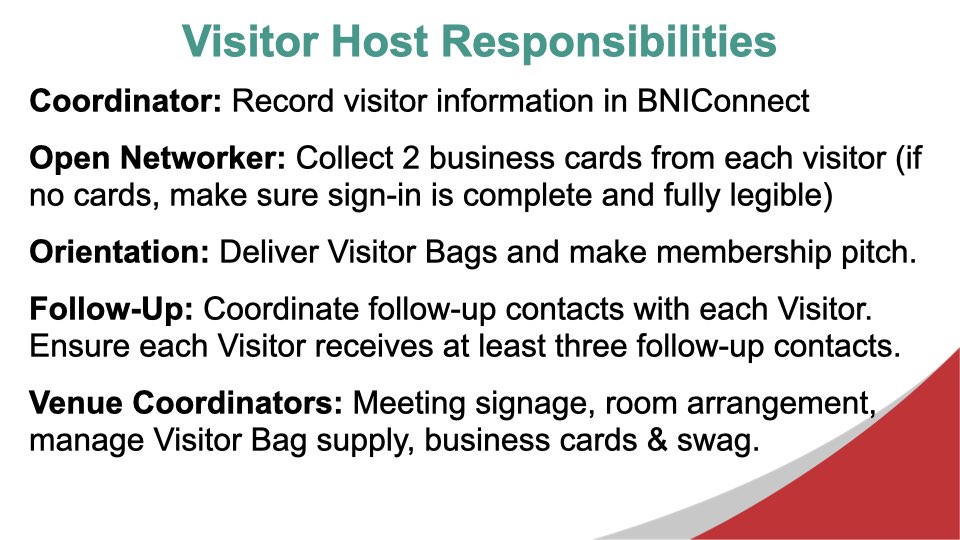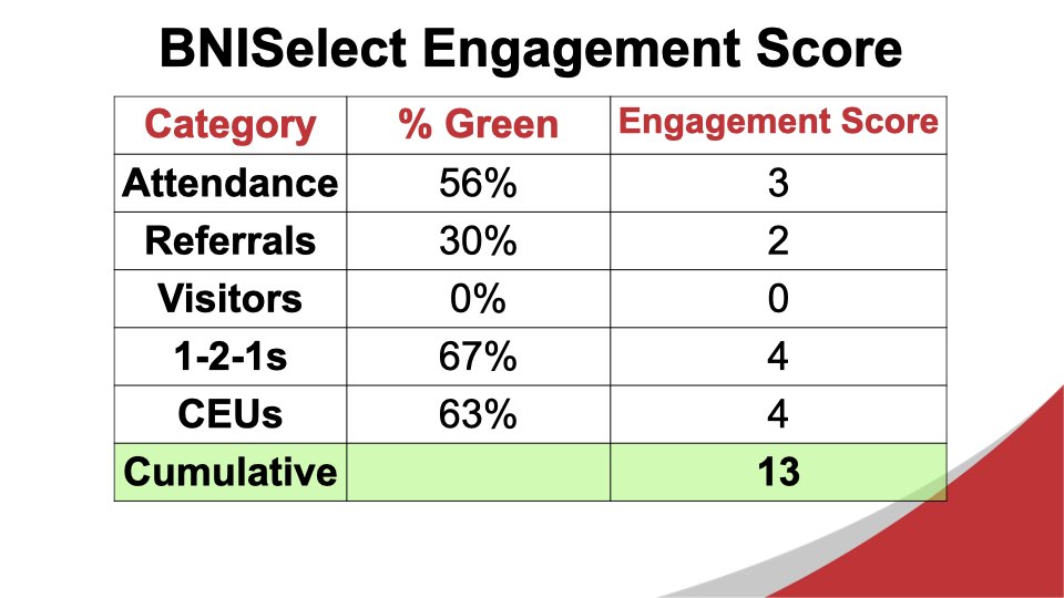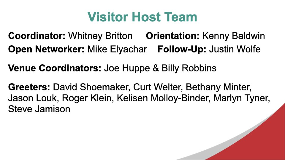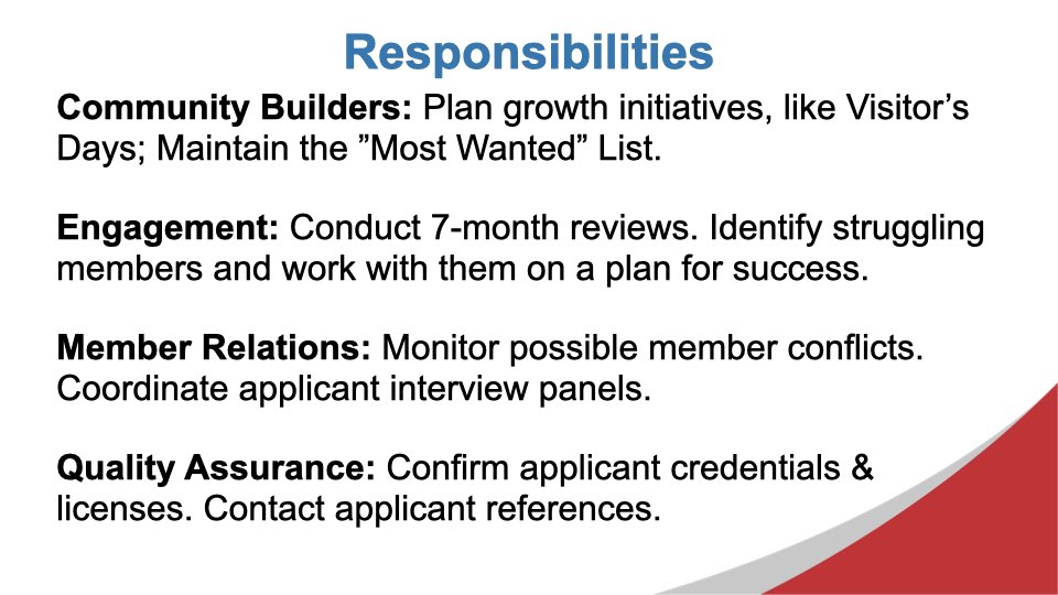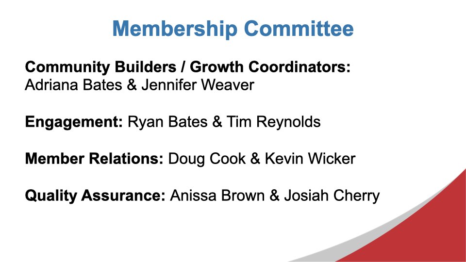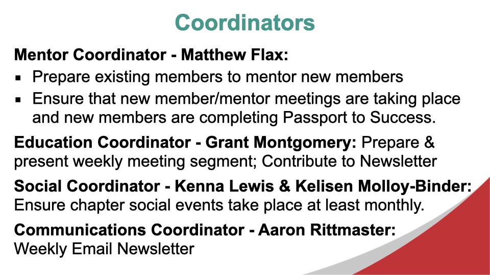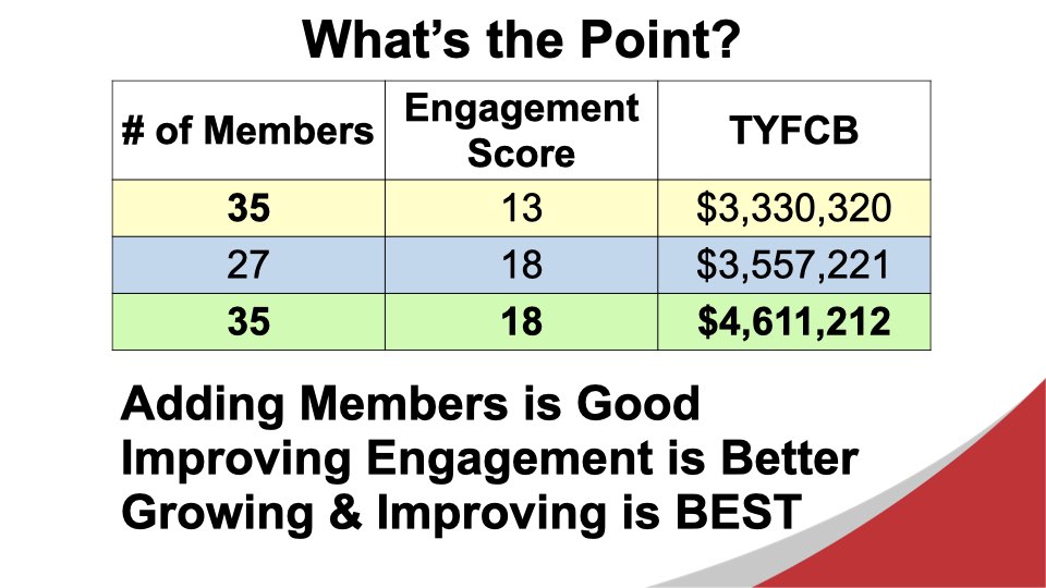 Excerpts from the September 25, 2025 Chapter MeetingDuring today’s meeting, we took some time to make sure that everyone in the chapter understands their leadership role when the new chapter year begins on October 1, 2025. We also looked at some data about the inputs that have the greatest impact on growing the chapter’s Thank You For Closed Business. During the Feature Presentation segment of the meeting, we looked at a vision for the chapter moving forward, as developed by the incoming Leadership Team, Aaron Rittmaster, Tara Comfort, and Brad Kaye.